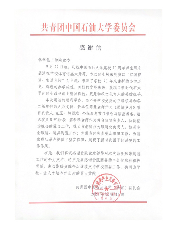 近日,公司党委收到公司团委发来的感谢信,对公司党委助力建校70周年师生风采展演工作予以高度评价,对公司的大力支持和全程参与晚会的师生表示真挚的感谢。