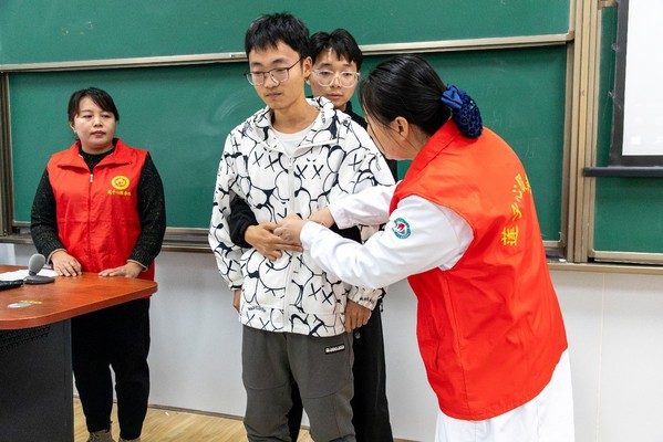 图为殷雪华邀请同学上台进行海姆立克急救法演示 申智诚摄
