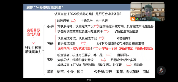 王兆兴首先总结了2023学年,年级在主题教育、日常管理、典型选树、学风建设、就业工作、员工党建、共青团等方面的工作思路、做法及成效。紧接着,他结合2023年就业数据及员工问卷调研数据,对员工就业关注的几个问题进行了分析与解答,建议员工们正确把握求职节奏,早准备、早选择,积极投递简历、参加面试。随后,他对2024年春季学期年级工作做出规划,根据各类毕业生选择分析了新学期应完成任务及注意事项,尤其是对于考研同学,应充分利用好寒假时间继续备考复试,并建议每一名考研同学都最好签一份保底的工作,有目标可选择的进行就业规划。最后,他又强调了寒假假期安全注意事项,结合真实安全事例,从消防安全、交通安全、用电安全、饮食安全、防溺水安全、网络安全、防电诈安全等八个方面,结合大量身边发生的安全事故教训进行了重点讲解,提醒同学们离校前务必要按照公司和公司要求,做好线上和线下的登记报备。会议最后师生互相送上新年祝福,同祝度过一个平安充实的假期。