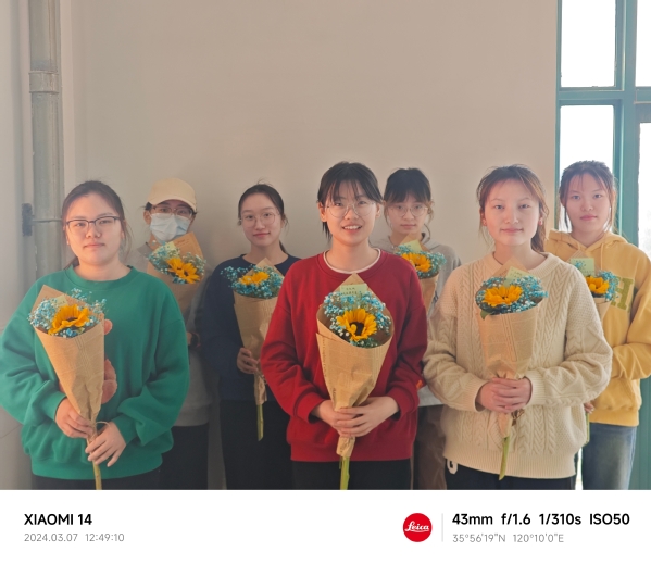 从古至今,中国女性便与花有着不解之缘。“花容月貌”“豆蔻年华”,花象征着女性的美好与温柔;而今天,“铿锵玫瑰”等词更是赞颂了女性的坚韧与顽强。烟花三月,各支部纷纷为女生献上了鲜花的祝福。本研化工2301团支部为所有女生送上一束由洋桔梗、石竹组成的鲜花,祝愿女生如洋桔梗般纯洁无邪,如石竹般正直勇敢;环境2302、化安2301、化工2302等支部也准备了玫瑰、向日葵等花束,祝愿女生饱含热情,永远阳光……笑靥与花瓣相映,清香在空中氤氲,“唯有青春与美好不可辜负”。