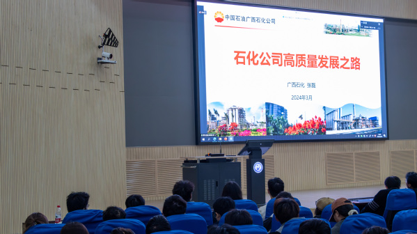 “希望大家将来可以加入广西石化公司,和我们一起怀抱梦想,善作善从,敢作敢为。也欢迎大家有时间来广西石化看一看。”在最后,张磊向员工们发起了真挚的邀请,邀请大家前去广西石化参观学习,了解更多关于石化工艺流程的知识,也邀请员工们将来加入广西石化,与他们并肩作战。张磊以石化公司高质量发展之路为主题的分享给每个化院学子上了一堂别开生面,生动形象的生涯规划课,加深了员工们对于石化行业的了解,为员工未来就业提供了一个清晰的方向。