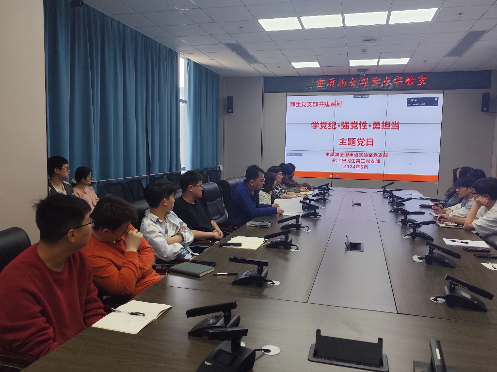 为了加强古镇口校区师生党支部的深入交流和支部联建共建,贯彻落实党中央和公司公司关于党纪学习教育工作的部署要求,5月10日下午,重质油全国重点实验室党支部联合化工研究生第三党支部在古镇口国重楼会议室开展“学党纪·强党性·勇担当”专题学习会。活动由支部副书记朱丽君主持,师生党员代表参加。