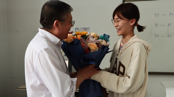首先,周天润对李宏勋教授的教员工涯进行简单介绍。接着,经管公司员工会员工代表范皙玥为李宏勋敬送鲜花并发表感谢话语。最后,本研化工2201全体成员在周天润带领下齐声喊“翰墨书香世代流芳,育人灵杰桃李满园。衷心祝愿李宏勋老师退休愉快,未来生活圆圆满满,顺顺利利”,表达对老师的祝福与感谢。