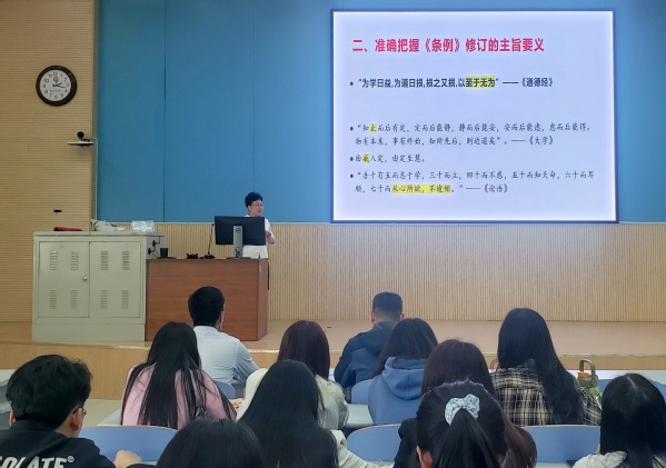 原丽红以《用好‘戒尺’,正风肃纪,树共产党人新形象——<中国共产党纪律处分条例>学习体会》为题,从“《条例》修订的背景、经过及看点”“准确把握《条例》修订的主旨要义”“以严明的纪律推进党的自我革命”三个部分,深入系统地对新修订《条例》进行了解读。她首先指出,《条例》是管党治党的重要基础性法规,不仅为惩治违纪违法行为提供了定性定量标准,也为广大党员提供了科学、合理的行为规范,使党员能够明确是非界限、清楚自律标准、守住行为底线。随后,原丽红深入解读了《条例》修订的主旨要义,讲解了《条例》在坚持党的领导、加强党的建设、推动全面从严治党等方面的重要内容。她强调《条例》将习近平总书记关于全面加强党的纪律建设重要论述转化为纪律要求,用贯穿党的创新理论的立场观点方法引领纪律建设工作,有利于为新征程上一刻不停推进全面从严治党提供坚强纪律保障。