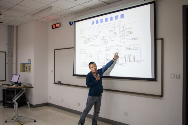 活动伊始,魏雯晓指出此次“企业导师进课堂”对于员工而言的意义所在,并介绍了主讲人曹传洋、刘良群。曹传洋作为第一位主讲人,用宣传短片向在场员工介绍抚顺石化企业的工作地点、生产装置与运行体系。然后,他通过详细的生产装置图着重讲解重油催化裂化概况及工艺原理,他讲到此工艺是是在催化剂的作用下,选择适当的操作条件以吻合正碳离子的单离子与双分子两部分反应从而生成气体、汽油等产物;紧接着介绍了烟机能量回收、余热炉、烟气脱硝、烟气脱硫、产品精制等八大原理。最后他希望化院的员工能够掌握扎实的基本功,在未来工作中可以将知识灵活运用。刘良群作为第二位主讲人以洗衣液在生活中广泛应用为例引出他所分享的内容:洗化厂磺化工艺装置工艺。他讲到抚顺石化关于这方面在市场中广泛应用;他通过流程图详细讲解了磺化这一过程所需的原材料与其以熔硫和干燥的空气燃烧,在有机物中发生一系列反应的工艺原理。