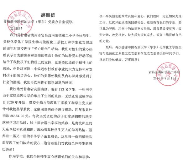 “我们是甘肃省陇南市宕昌县南阳镇第二小学全体师生,感谢贵校MK体育生物与能源化工系教工和员工党支部连续四年的爱心助学活动!”近日,一封跨越一千四百三十公里的感谢信,让公司能化系的师生激动不已。这背后是一段四年爱心接力、公益助学“开花结果”的感人故事。