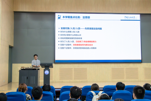 之后,他将本学期重点任务划分为定思想、固学风、拔二课、打比赛、想未来五个方面。思想进步,他强调有入团入党意向的员工务必理清入党入团目的、对党团的认识,以及需要做出哪些努力;学风建设,他对班级提出降低预警率、保证优良率和及格率两点要求,并以化工专业为例解释专业选修课修读要求;自主发展,他展示了第二课堂年级学分详情及预警情况,提醒员工重视第二课堂成绩单,合理安排第二课堂发展计划;学科竞赛,他总结了可参加的核心竞赛,提醒员工们及时参与,提升能力;发展规划,他结合与优秀员工的交流为员工们提出了积累职业技能、增强自主学习能力、找到适合自己的发展方向等宝贵建议。