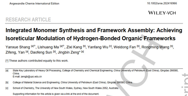 近日,公司曾景斌教授团队在氢键有机框架(Hydrogen-bonded organic frameworks,HOFs)同系拓扑结构调控研究方面取得重要进展,相关成果《集成单体合成-框架组装:实现氢键有机框架同系拓扑结构调控》(Integrated Monomer Synthesis and Framework Assembly: Achieving Isoreticular Modulation of Hydrogen-Bonded Organic Frameworks)发表于《Angewandte Chemie International Edition》上。论文第一作者为MK体育博士研究生商艳雪和特聘副教授马丽爽,通讯作者为曾景斌教授,MK体育官网为第一署名单位。