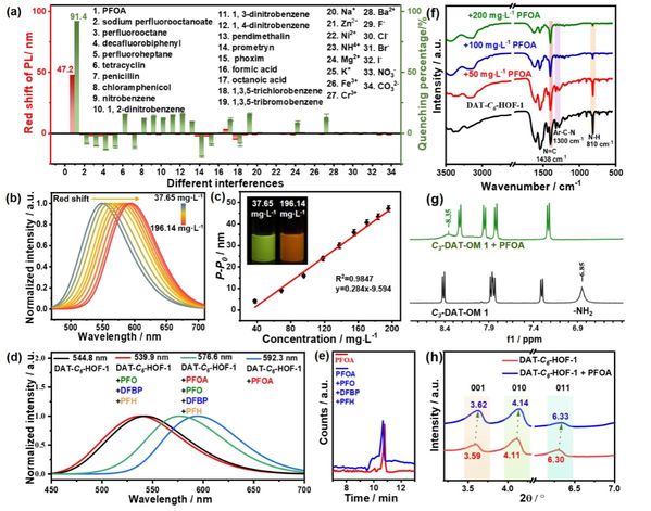 针对上述问题,曾景斌教授团队提出了“单体合成-框架组装”(ISA)一体化策略,用于系统构建二氨基三嗪基(DAT)HOFs,即合成构建DAT-HOFs所用的OMs,同时可以实现HOFs的组装过程,其可以最大程度保留原始氢键状态有效避免由于OMs溶解和再结晶过程引起HOFs的拓扑结构差异。在ISA策略下,曾景斌教授团队成功地构建了一系列基于三苯胺具有(6, 3)-c连接hcb拓扑的DAT-C6-HOFs(-1,-2,-3)。研究通过可控地调节C3对称氰基前体(C3-CPs),可以实现DAT-C6-HOFs孔径和环境的定制调控;通过X-射线单晶结构解析以及密度泛函(DFT)理论计算,明确了DAT-C6-HOFs成功组装的必要条件是其氰基合成前体的平面型C3对称分子构型以及双氰胺合成前体形成的氢键六聚体团簇诱导模板的共同作用,并详细探究了DAT-C6-HOFs(-1,-2,-3)对PFOA的检测性能,分别从结构和电子转移层面揭示了检测机制。该研究不仅为定向设计和合成同拓扑结构的HOFs提供了可行的策略,使得系统研究HOFs结构与性质之间的构效关系成为可能,也为其他分子晶体的结构调控提供了新的思路。