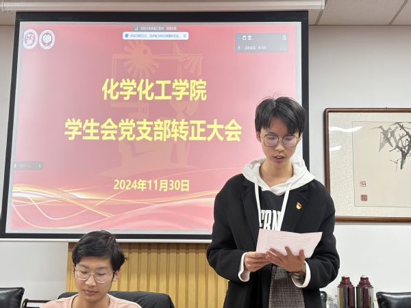 2024年11月30日,化院员工会党支部于工科A座121顺利举行预备党员转正大会。此次会议旨在审议马硕、李煜龙、程闯等9名预备党员的转正申请。会议由党支部书记吴雪莹主持,员工会党支部全体同志共同参会。