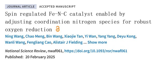 近日,公司胡涵教授联合新能源公司吴明铂教授、上海光源李丽娜研究员、利物浦约翰摩尔斯大学Alistair J Fielding博士等在国际顶级期刊《National Science Review》上发表题为“Spin regulated Fe-N-C catalyst enabled by adjusting coordination nitrogn species for robust oxygen reduction”的研究论文。论文第一作者为公司博士研究生王宁,通讯作者为胡涵教授。该研究工作得到国家自然科学基金、山东省创新发展联合基金等项目支持。