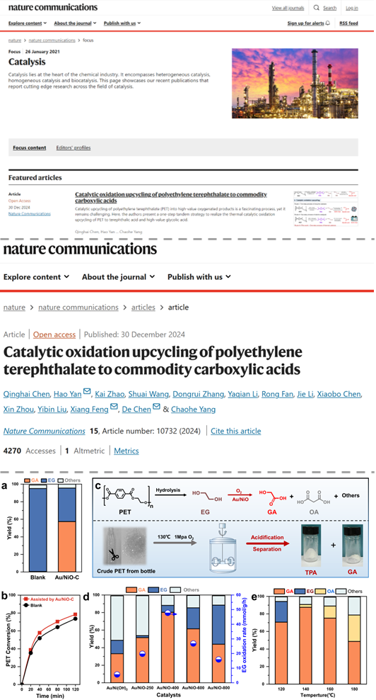 聚对苯二甲酸乙二醇酯(PET)作为全球消费量最大的聚酯材料,广泛应用于包装、薄膜等领域,每年有大量废弃PET被遗弃在自然界中,稳定的结构导致在自然环境中难以降解,造成严重的白色污染。在“双碳”发展理念和循环经济的发展格局下,推动废塑料的高值化转化既可以实现废塑料再生利用,减少化石能源使用,又可以降低二氧化碳排放,保护生态环境安全。针对废弃PET中丰富的含氧单体,将其中乙二醇(EG)转化为高价值的乙醇酸(GA)无疑是一种具有前景的方法。研究团队首次提出热催化一步解聚氧化策略,将聚酯直接转化为商品级乙醇酸晶体。废弃PET在Au/NiO的催化下实现解聚和氧化串联反应,再经过分离和纯化操作,最终得到收率为77.51%的乙醇酸晶体,并通过在载体上引入氧空位,调控催化剂对底物的吸附,从而减弱氧化过程中对苯二甲酸(TPA)的抑制效应,加快乙二醇到乙醇酸的反应速率,实现PET到乙醇酸的高效转化。对比传统的碱性水解,该工艺可获得更高的经济收益(1500$/ton)及产生更少的二氧化碳排放(减少2.25kgCO2-eq/kg PET)。同时将该策略应用于其它聚酯类塑料回收,均获得较高乙醇酸收率(>80%),证明该策略具备较大的工业化应用潜力。相关成果以“Catalytic Oxidation Upcycling of Polyethylene Terephthalate to Commodity Carboxylic Acids”为题发表在NatureCommunications上,并被主编遴选为专题文章(近期发表在催化领域上最好的50篇论文),MK体育官网为第一署名单位。