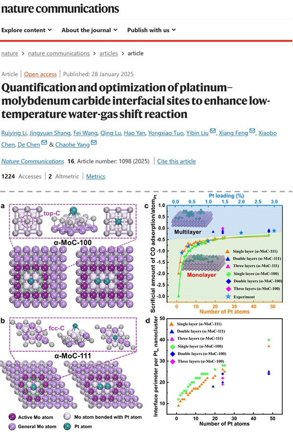 水煤气变换(water-gas shift,WGS)的工业应用已有90多年的历史,WGS反应不仅是重要的制氢(H2)来源,也是去除CO的关键过程。研究团队提出了一种DFT计算和化学吸附相结合的方法来定量分析Pt/α-MoC催化剂中Pt团簇尺寸的方法,通过搭建不同Pt原子数量的Ptn/α-MoC-111和Ptn/α-MoC-100模型,构建了包含Pt团簇尺寸、铂原子的CO吸附损失量、界面周长的数据库。研究发现,在100-200oC的低温水煤气变换反应中,碳化钼上完全暴露的单层Pt纳米团簇表现出的质量活性比块状碳化钼催化剂高出一到两个数量级,可实现Pt原子的最大化利用,其CO转化率在160 °C温度下达到97.6%。同时,此方法有效地量化了描述活性位密度的关键指标-界面周长,也为了解Pt的微观结构提供了突破性的见解。相关成果以“Quantification and optimization of platinum-molybdenum carbide interfacial sites to enhance low-temperature water-gas shift reaction”为题发表在NatureCommunications上,MK体育官网为第一署名单位。