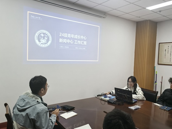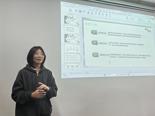 首先,新闻中心、文体中心、综合事务中心依次汇报了上学期工作成果及本学期工作计划。新闻中心主任张渝培对上学期工作进行了总结,并对本学期的工作计划进行了汇报。上学期,新闻中心撰写新闻稿件,涵盖学术交流、文体活动、志愿服务等各类校园动态,完成了基本的宣传任务。本学期,新闻中心将围绕“讲好年级故事,弘扬优良学风”这一核心目标,着重培养成员的组织、写作与摄影三大能力,计划推出“他山之石”年级专栏,挖掘优秀同学的学习方法与备考经验,帮助同学们不断进步。