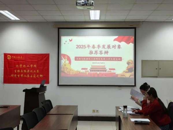 为进一步推进2025年上半年的党员发展工作,严格落实《中国共产党发展党员工作细则》要求,加强对发展对象的培养、教育与考察,严把党员发展质量关。2025年03月05日晚上20时,生物与能源化工系研究生第二员工党支部于逸夫楼340召开发展对象推优答辩大会。会议由支部书记李钰主持。李钰同志与组织委员钱爱枝同志,宣传委员艾思涵同志担任答辩评委。