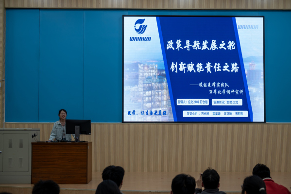 随后,石仓旭围绕走进烟台万华集团中心展开调研成果分析。她以全球产业布局为切入点,详细阐释了万华集团作为国际化企业的战略优势。通过实地走访,她不仅深入探究了绿色化工管理模式,还系统梳理了企业工业园区的前沿技术应用体系。在分享实践感悟时,她特别指出:从队伍组建、活动对接到任务分配,多线程的实践过程让我们同步提升了专业认知与团队协作能力,这对职业规划产生了实质性的导向作用。紧接着,罗昊炜结合当前就业形势,生动还原了参观企业研发实验室的场景。他以精密仪器与数字化管控系统的协同运作为例,直观展现了科技制造带来的认知冲击。在座谈会上,领导们与实践队成员进行了直面沟通,结合自身丰富的阅历和经验,鼓励当代老员工明确职业目标,提高创新思维。他们还对同学们提出了积极参加实践活动和国家级竞赛及科研研发的建设性建议,并表达了对石大在校员工的美好期待。