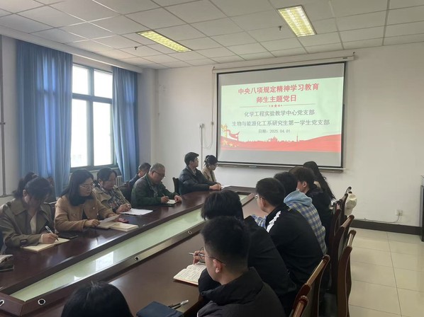 为深入贯彻落实中央八项规定精神学习教育,进一步学习习近平总书记关于加强党的作风建设重要论述,4月1日上午,化学工程实验教学中心党支部联合生物与能源化工系研究生第一员工党支部在工科A325召开“深化中央八项规定精神学习,筑牢廉洁自律防线”主题党日活动,活动由化学工程实验教学中心党支部书记张淑霞同志主持,两支部师生党员参加。