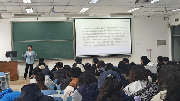 原丽红老师围绕“以上率下,驰而不息:中央八项规定的制定实施和破题深化;正风肃纪,立党为公:领会中央八项规定自我革命的精神内核;唯真唯实,谨慎用权:改进作风学习贯彻好中央八项规定精神”三个方面展开宣讲,她结合习近平总书记关于全面从严治党的重要论述,运用大量史料、典故、案例,系统阐述了制定中央八项规定的历史背景、中央八项规定的主要内容、精神内核、现实意义以及如何深入贯彻中央八项规定精神。原老师指出,“小洞不补,大洞吃苦”,党员干部包括全体党员都要以中央八项规定精神为指引,从身边的小事做起,牢固树立廉洁意识,坚决反对形式主义、官僚主义,以优良作风凝聚干事创业合力。