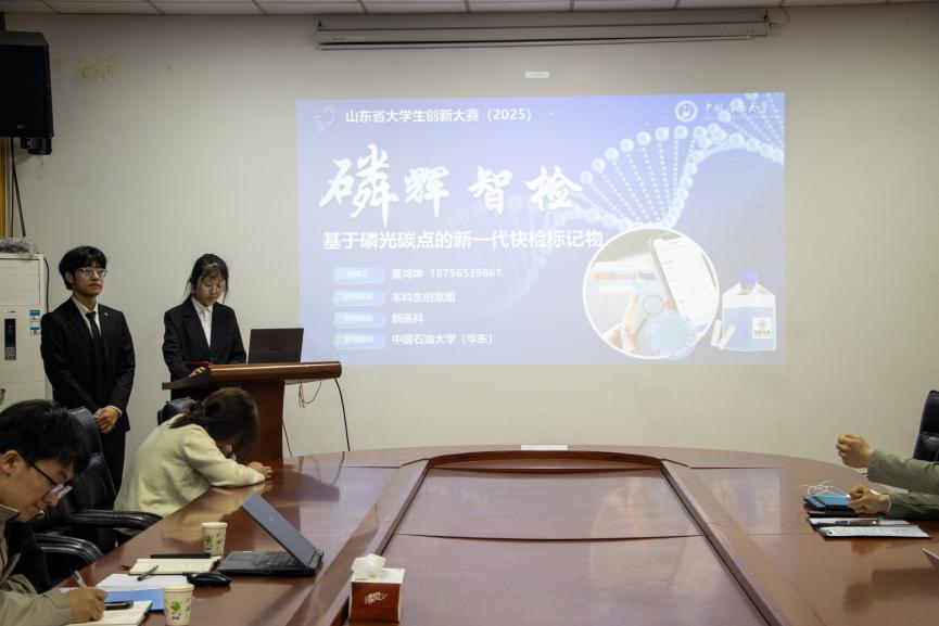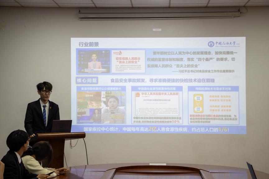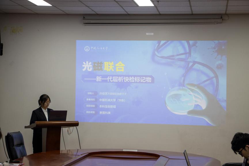 本次推进会特别邀请到2024年国创赛银奖获得者马晨同学。他在会上进行了精彩的项目路演展示,结合备赛经验,剖析优秀项目的特质,从项目的创意起源、技术实现路径、市场应用场景,到路演时的展示技巧与答辩要点,都进行了全面细致的讲解,为同学们的项目改进提供了宝贵的参考方向。随后,公司精心筛选的12个参赛项目依次进行路演答辩,通过PPT展示、陈述,充分展现项目的创新点、可行性和应用前景。王兆兴和马晨认真听取每个项目的汇报,针对项目的创新性、商业价值、团队协作、展示效果等多个维度进行专业点评。