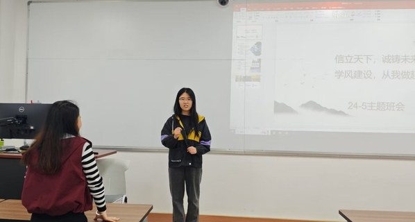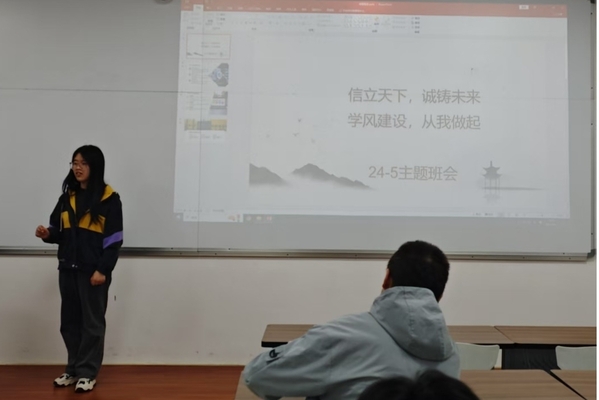 班会在一段关于诚信的视频短片中拉开帷幕,视频中生动的案例和深刻的讲解,让同学们对诚信的内涵和价值有了更直观的认识。随后,班长冯丽欣结合近期高校典型案例,强调了诚信在个人成长、社会交往以及学术生涯中的关键作用,指出学风建设是班级发展的重要基石,而每一位同学都是这一建设的参与者和推动者。