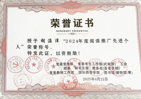 在大公司园这片充满希望与活力的知识沃土上,阅读恰似点点繁星,照亮学子们探索未知的漫漫征途;而阅读推广人,则宛如那穿梭于星辰之间的使者,以热情为笔,绘就着校园浓厚的书香画卷。今天,我们一起走进“2024年度阅读推广先进个人”胡溢洋的书香世界,探寻他在阅读推广旅程中的点点滴滴。