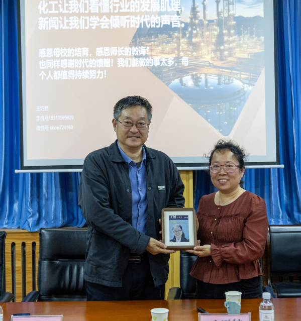 王巧然深情回顾了在公司的求学经历,她感谢了公司的悉心培养,在今天的交流研讨中感受到了一代代化院新闻工作者的薪火传承。她向员工们分享了自己报道沙漠公路绿化工程、油品质量升级、福建长汀催化剂项目的工作经历。她指出,石油石化行业是关系国计民生和能源安全的重要支柱,新闻工作者要有使命感、践行好社会责任。她建议在座的员工记者要多观察勤思考、主动学习高质量新闻作品,用好专业优势,在挖掘线索和撰写新闻的过程中不断提高自己的写作功底。