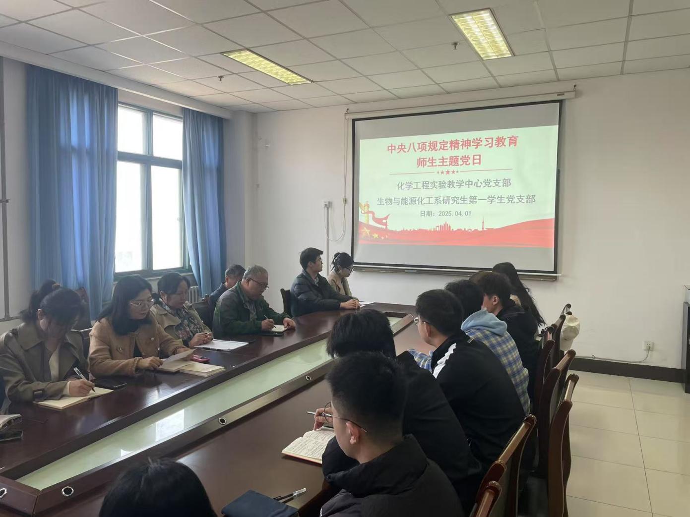 为持续推进深入贯彻中央八项规定精神学习教育,化学工程实验教学中心党支部联合生物与能源化工系研究生第一员工党支部于4月1日开展学习中央八项规定精神,以严实作风推动高质量发展 为主题的组织生活,通过理论学习、案例警示、学习感悟等环节,推动党员干部深刻领会中央八项规定精神实质,筑牢拒腐防变思想防线。化学工程实验教学中心党支部张淑霞同志主持会议。