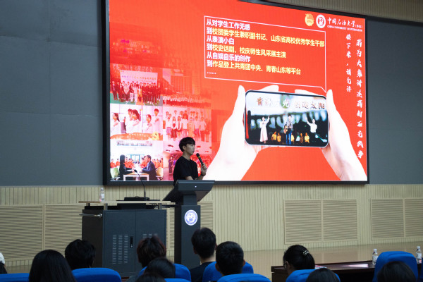 本次课程以兴趣与特长的辩证关系为切入点,苏国阳结合自身成长轨迹,生动阐释了热爱如何转化为成长动能。作为校园文化建设的中坚力量,他将歌唱特长融入校庆晚会、文艺汇演等品牌活动,原创多首校园主题歌曲;在创造太阳话剧社的历练中,通过千余小时的剧本打磨与舞台实践,成长为校园戏剧节的核心主创。兴趣是破土的嫩芽,特长是深耕的硕果。他强调,唯有以持续的努力浇灌热爱,方能将兴趣升华为服务集体、展现价值的专业能力。