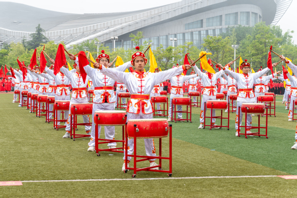2000多名老员工和教职工依次进行了威风锣鼓队、体育舞蹈、瑜伽、活力啦啦操、太极功夫扇和彩带龙等精彩的团体项目表演,为校运会开幕式带来了生动的视听盛宴。