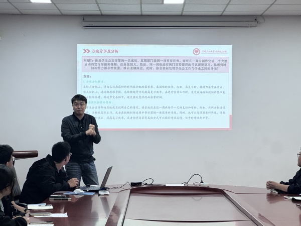 为保证培训效果,本次培训采用无领导小组讨论的形式。中心成员分为三组,各组在组内剖析问题本质,讨论解决方案,最终各组派代表对问题进行阐述并给出解决措施。第一组讨论学业压力与工作压力间的平衡问题,通过划分学习与工作的优先级来处理工作与学业间的冲突。第二组则聚焦个人与团体间的冲突,通过召开集体会议、举办集体活动来提升集体意识。同时关注个体的独特见解并发挥其积极作用。第三组侧重分析集体间的矛盾,遵循“少数服从多数”原则,满足大多数同学的利益。通过对比各组成员的汇报与AI给出的参考答案,王兆兴指出,部分方案陷入“效率”误区,认为提升效率可以有效缓解压力;其忽略了时间总量一定的刚性约束,效率更高不见得质量更高。