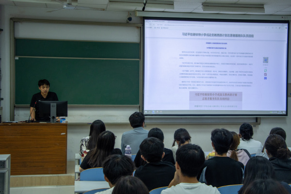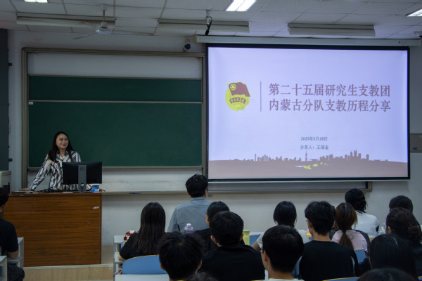 随后,第25届研究生支教团内蒙古分队队长、校团委兼职副书记王瑞崟分享了自己的支教经历及感受。王瑞崟讲述了在支教过程中,面对艰苦的教学条件和员工们对知识的渴望,如何克服困难,开展教学工作。他提到,通过与当地员工和家长的深入交流,不仅帮助孩子们提升了学业成绩,更在文化交流与情感沟通上取得了显著成果,自己也在这个过程中收获了成长与感动。这些真实而生动的经历,让在场成员对支教工作有了更直观、更深刻的理解。