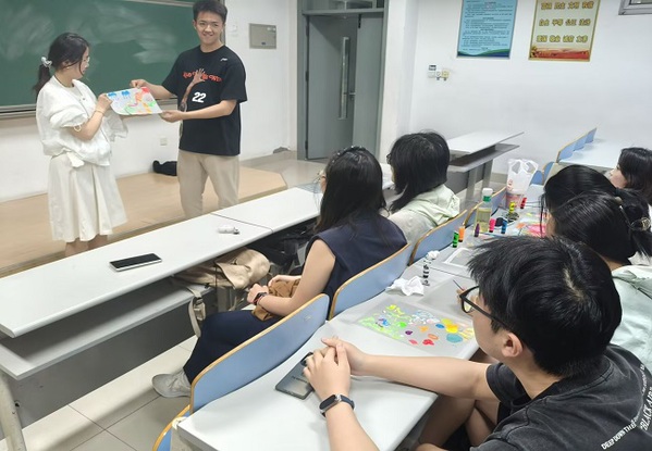 活动现场,胶片成为传递情绪的“信使”,将抽象心理状态转化为具象艺术表达。参与者围绕“焦虑、勇气、蜕变、接纳”等关键词,运用透明胶片、冷色调荧光颜料等材料,结合学习生活中的真实经历创作作品:螺旋线条勾勒压力与动力的博弈,分支链条象征社交圈的延伸拓展,断裂又重组的化学键则映射挫折后的心理修复。同学们手持亲手制作的胶片,分享创作构思:扭曲褶皱、暗角重叠的胶片,是“焦虑的阴影”,对应着压力下混沌思绪;穿透孔洞的明亮光线,化作“勇气的光束”,象征黑暗中燃起的希望;褪色与新生交织、光影结构重组的画面,晕染出“蜕变的光晕”,诉说破茧成长的历程。色彩斑斓的胶片碎片经拼贴,交织成流动彩虹,破碎重生的故事化作温暖光晕,传递着治愈力量。同学们围坐交流,创作者讲述胶片背后的情绪故事,聆听者在斑驳纹理里捕捉共鸣,于光影交织中直面内心,读懂情绪、接纳自我,收获心灵治愈与成长动力。