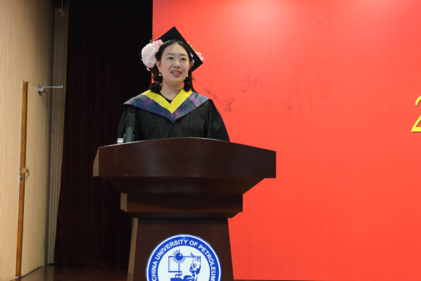化学工程与工艺专业2021级本科生牛小月作为本科生代表发言,她深情回顾了在公司求学的充实生活,是公司和公司给予了他实现科学梦想的机会,他表示今后会在追求科学的道路上奋勇前进,为国家能源事业贡献才智和力量。