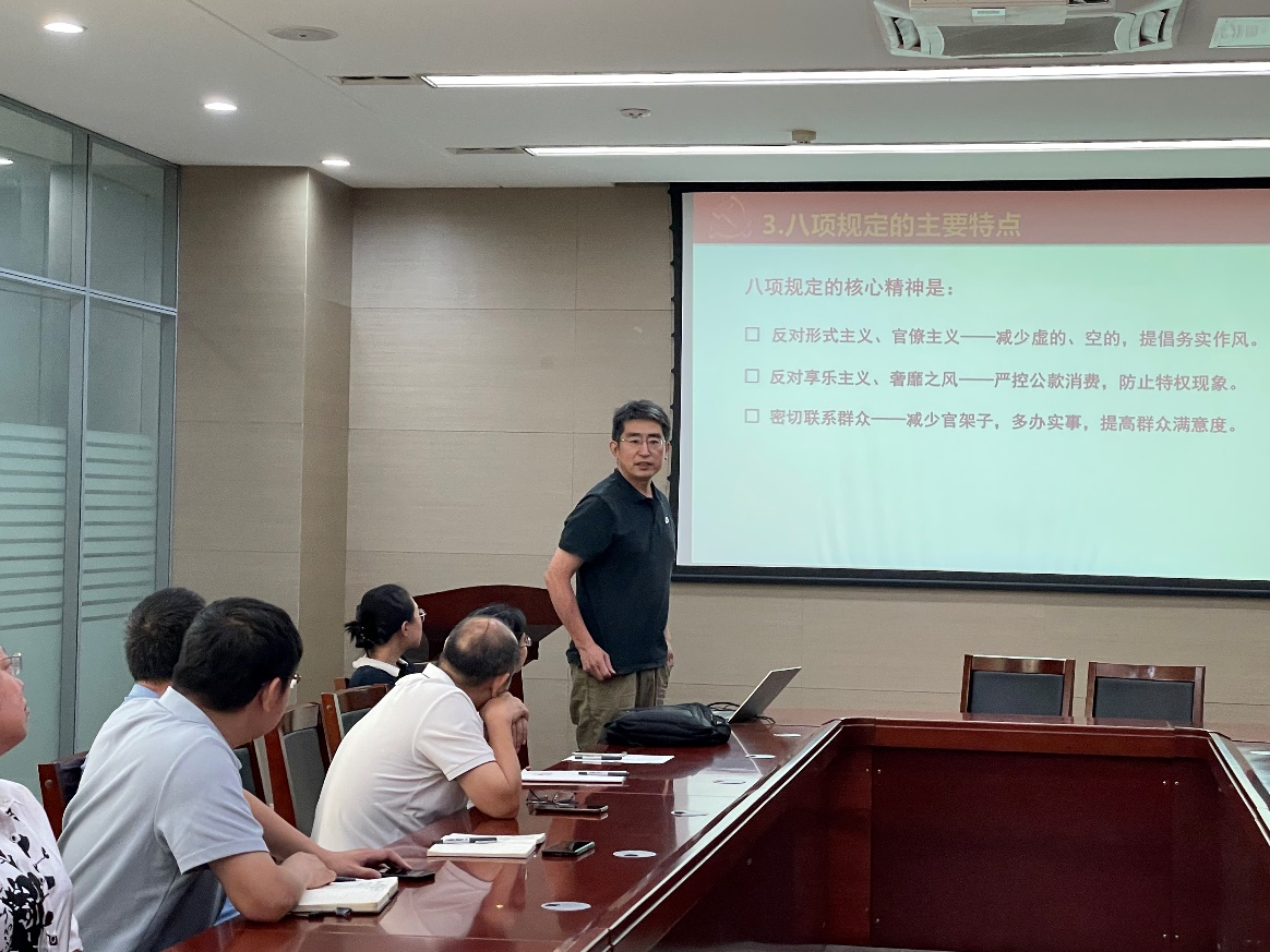 随后,支部书记王创业给党员们讲“学习落实中央八项规定精神”的主题党课,内容包括“中央八项规定”的背景意义与核心内容、为什么要落实“中央八项规定精神”,以及如何结合工作实际落实“中央八项规定精神”。他提出,作为高校教师,要以员工为中心,关注员工全面发展,以身作则,在课堂教学、师生交往中传递清正廉洁价值观,将作风建设与团队建设、人才培养相结合,持续推动党建与业务深度融合,以优良党风带动师德师风建设,为培养新时代高素质人才提供坚实保障。