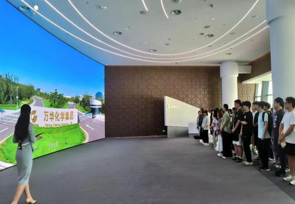 第一站,实践队队员来到了万华科创楼展厅,在这里实践队成员们详细了解了烟台万华集团的发展变革、科研成就、企业文化等方面情况。密密麻麻的专利墙上,覆盖了聚氨酯,石化,精细化学品等多个领域,每一项都代表着万华化学的突破与创新,让人为之震撼。