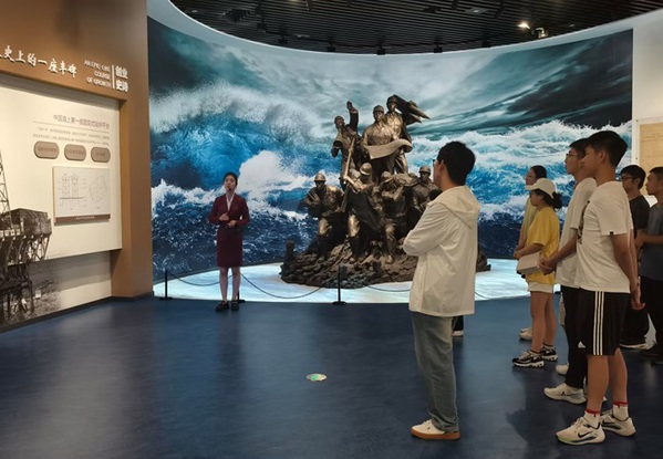 队员在讲解员带领下了解钻井平台发展历史 张梦宇摄