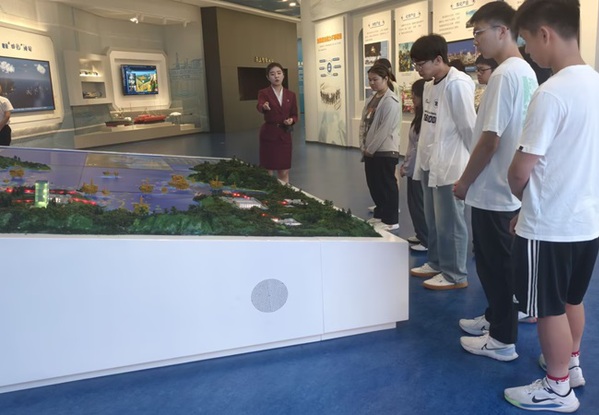 讲解员为队员讲解海上石油平台分布 张梦宇摄