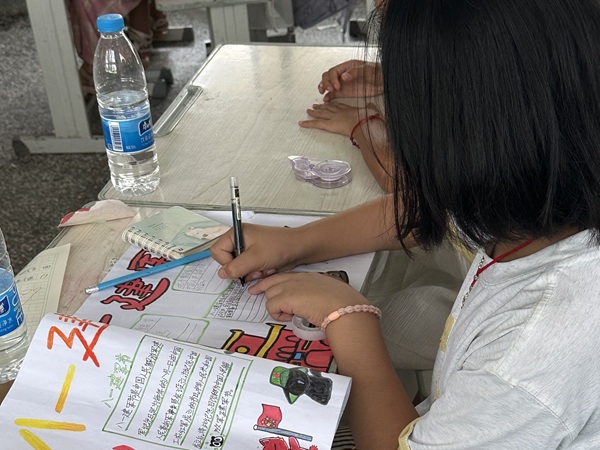 支教队员们提前准备了彩笔、画纸、模板等材料,还展示了一些优秀手抄报范例供孩子们参考。有的孩子以“建军节的由来”为主题,认真抄写着从课堂上学到的历史知识;有的孩子描绘了解放军叔叔站岗、训练的场景,旁边配上“你们辛苦了”的暖心话语;还有的孩子画出了现代化的军舰、战机,用稚嫩的笔触勾勒出对强军梦的向往。