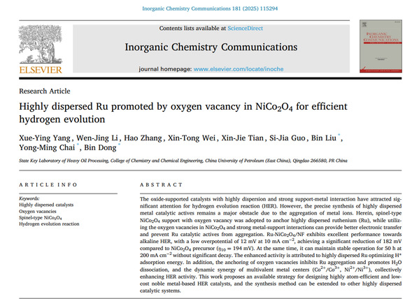 近日,我院绿色能源化工团队指导的2022级化工(本研)本科生杨雪颖的科研成果“Highly dispersed Ru promoted by oxygen vacancy in NiCo2O4 for efficient hydrogen evolution”在SCI期刊Inorganic Chemistry Communications在线发表。公司2022级化工(本研)杨雪颖同学为论文第一作者,绿色能源化工团队刘宾教授、柴永明教授、董斌教授为共同通讯作者,MK体育官网为唯一署名单位,该工作获得国家自然基金面上项目(22278440,52274308)和中国石油大学自主创新强基专项(24CX03012A)的资助。
