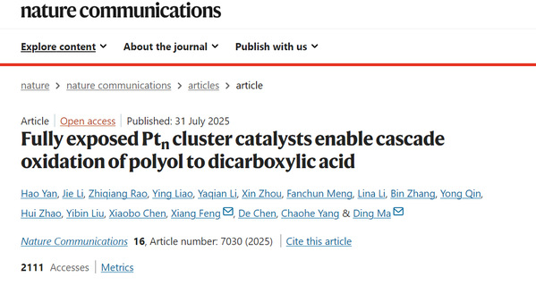 化工系闫昊副教授聚焦醇类和废塑料高值化领域,积极参加“中国化工学会能源材料与化工学术会”、“京博绿色高端化学品创新发展论坛”、“中国化工学会应星论坛”等学术会议,并做相关学术报告。暑假期间,在Nature Communications上发表《Fully exposed Ptₙ cluster catalysts enable cascade oxidation of polyol to dicarboxylic acid》为题的最新研究工作,在金属团簇催化多元醇氧化领域取得重要突破。