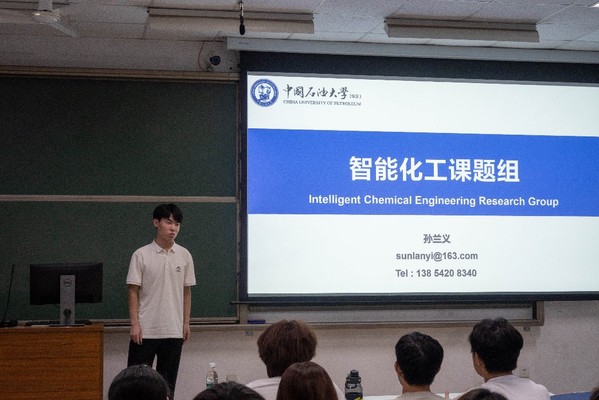 智能化工课题组优秀博士生张振宇进行介绍,他围绕人工智能与化工过程的深度融合,讲解了课题组在化工流程智能优化、反应过程数字孪生等方向的研究进展。他结合具体的算法应用案例,向同学们展示了智能技术如何提升化工生产的效率与安全性,同时介绍了课题组在员工培养中注重编程能力与化工专业知识结合的特色,为有交叉学科学习兴趣的新生提供了明确的努力方向。