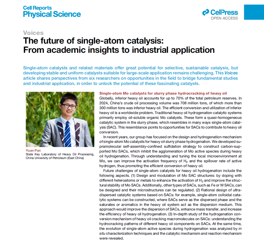 公司潘原教授受邀发表了题为《Single-atom Mo catalysts for slurry phase hydrocracking of heavy oil》的Voices评论,系统阐述了单原子催化剂在重油浆态床加氢领域的前沿进展与未来挑战,为该领域的研究提供了创新性思路和见解。