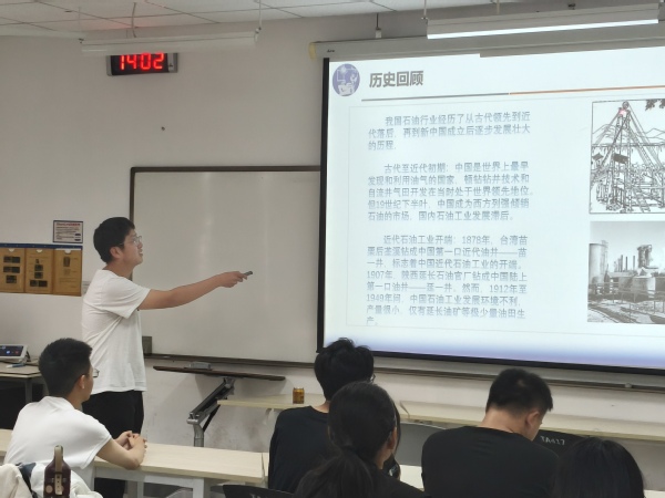 班会开篇,秦椿棠以“新中国能源事业如何从‘一穷二白’走向自立自强?”破题,随后衔接我国现如今的能源结构,介绍完之后话锋再次转回开国之后应化人在其他领域做的贡献,最后着重强调:“先辈们攻克的不仅是技术壁垒,更是‘能源饭碗必须端在自己手中’的信念!”同学们凝视老照片里破旧的炼油厂再回望今朝的机械自动化油田,对“爱国与奋斗”的联结形成具象认知。在这之后,他又一次强调当下国家在能源领域的步步为营,以及向“石化强国”跃进的愿景。不少同学热血沸腾,跃跃欲试。